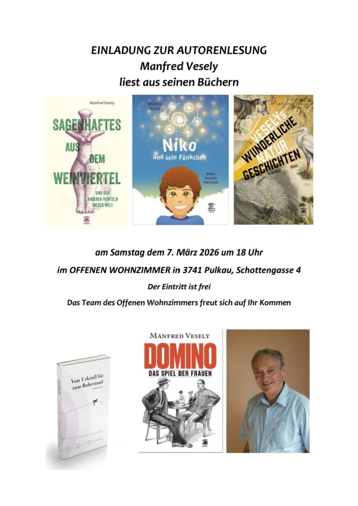 Im September 2016 las Manfred VESELY bei einer Veranstaltung des Verbandes Katholischer Schriftsteller Österreichs in den Räumlichkeiten des Deutschen Ordens und bei der Gesellschaft der Lyrikfreunde einige Kapitel aus dem Roman DOMINO